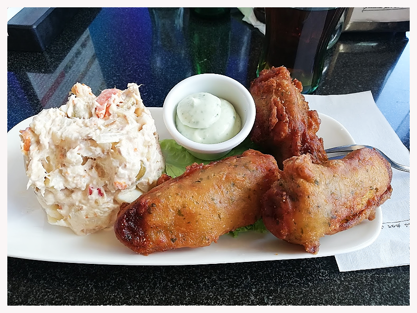 Pan de Bocadillo con Calamares Fritos, queso amarillo y alloil lo Mayonesa)